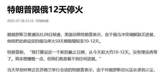 就在7月底,特朗普在苏格兰和英国首相会见前,面对记者媒体对当前俄乌形势的采访,特朗普对普京大肆指责。 用了“十分失望”四个字来形容普京,并且还表示:“我打算从今天起,设定一个新的最后期限,大约是10到12天。没有理由再等下去了……我们根本看不到任何进展。”
