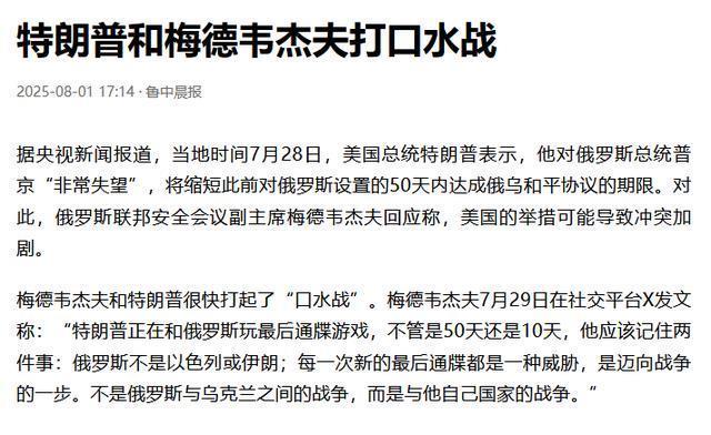 很明显,特朗普对普京的忍耐已经到了极限,直接从50天的期限下降到了10-12天。 就在特朗普宣布了这一消息后不久,普京的好友同时也是俄罗斯前总统的梅德韦杰夫忍不住了,在社交平台上直接对特朗普开火。